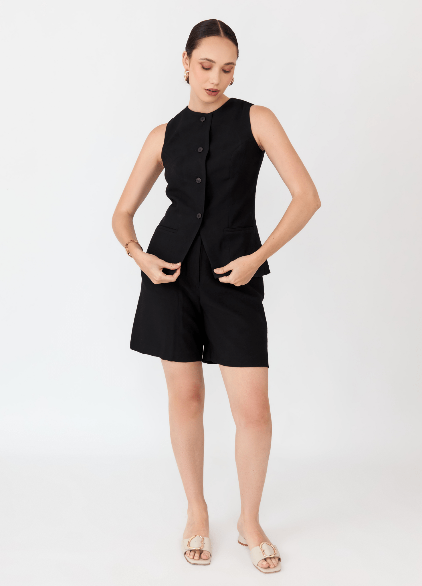 La Bermuda Jenn es la prenda esencial e imprescindible para enfrentar los días cálidos con total estilo y confort. Su diseño se enfoca en la silueta veraniega con un corte a la cintura y un fit regular que garantiza un ajuste cómodo y favorecedor. Los pliegues encontrados en el delantero son un detalle clave, que no solo aporta un aire refinado y contemporáneo a la prenda, sino que también añade el volumen y movimiento ideal para un look fresco y chic.