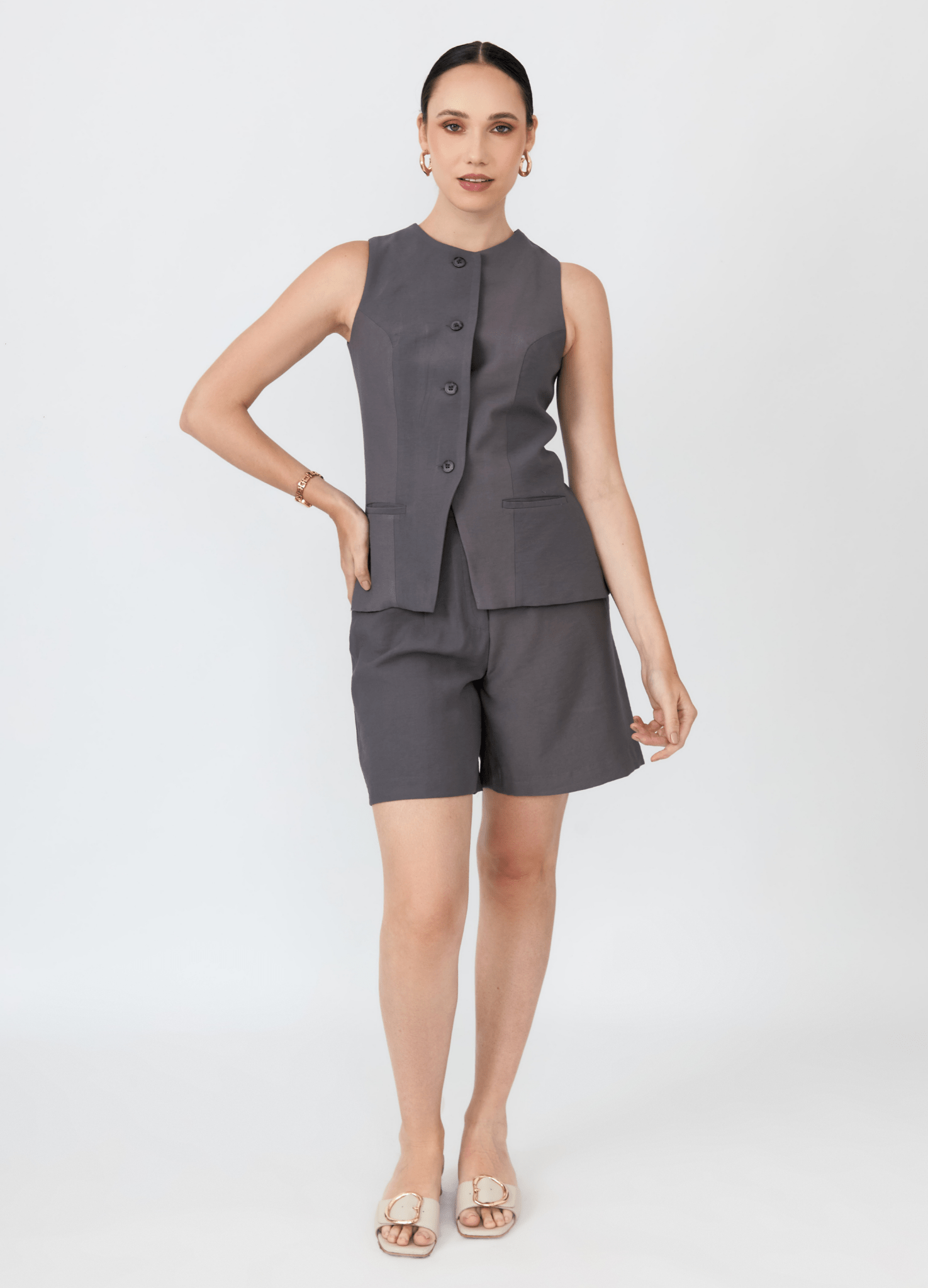 Pensando en la funcionalidad sin sacrificar la estética, la bermuda incluye discretos bolsillos laterales que son completamente invisibles. Además, cuenta con pasadores para cinturón, permitiendo personalizar el ajuste y el estilo con accesorios. En la parte trasera, un bolsillo con un vivo sutil completa el diseño con un toque pulido. La Bermuda Jenn es perfecta para crear un look casual, fresco y elegante, ideal para paseos, salidas de día o cualquier actividad bajo el sol.