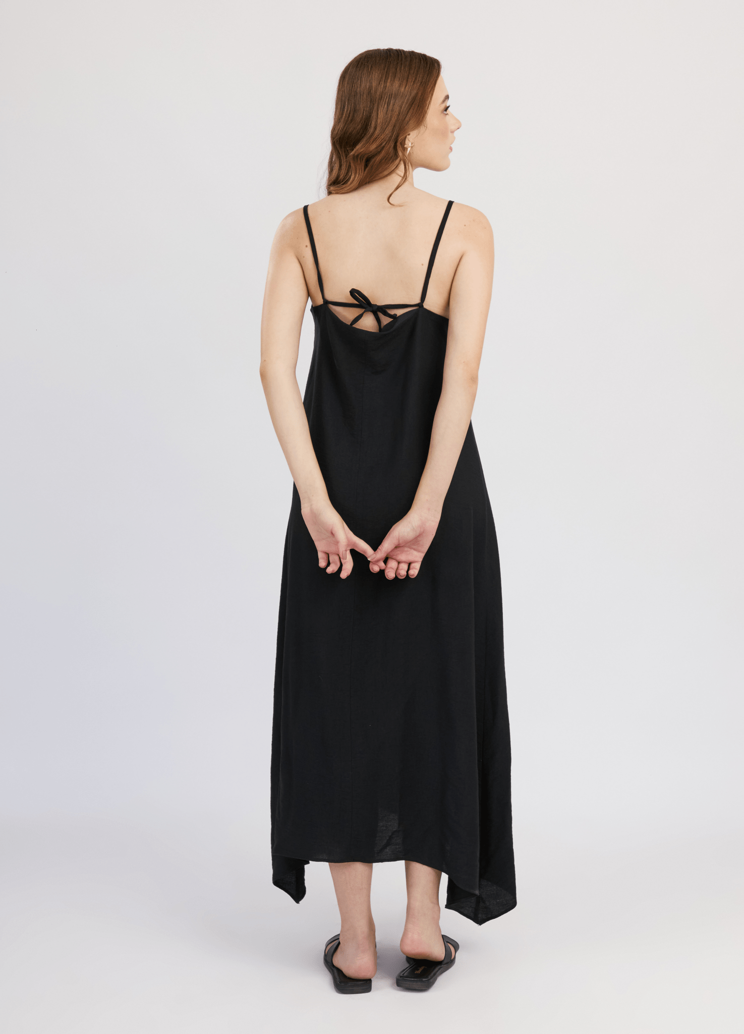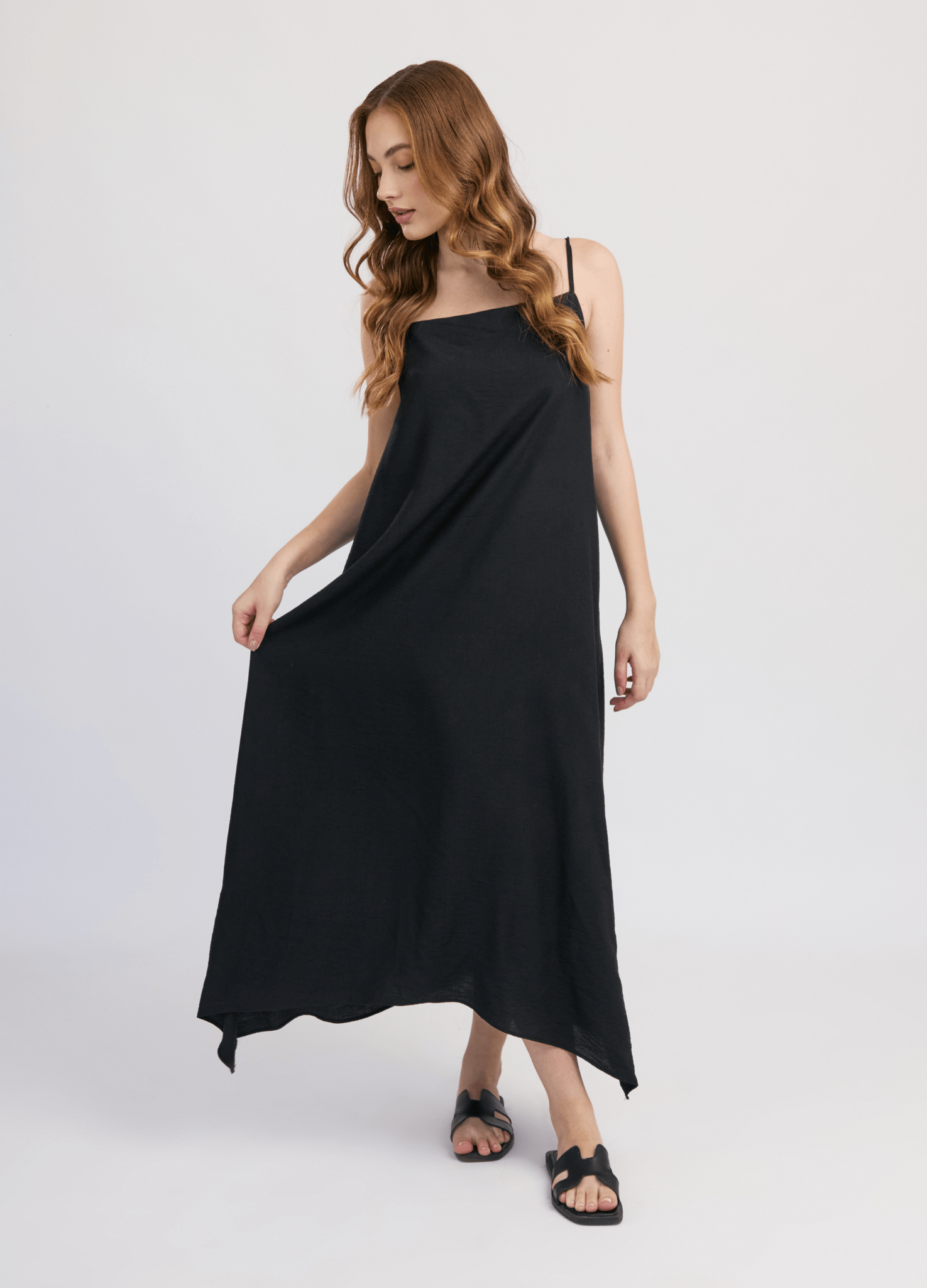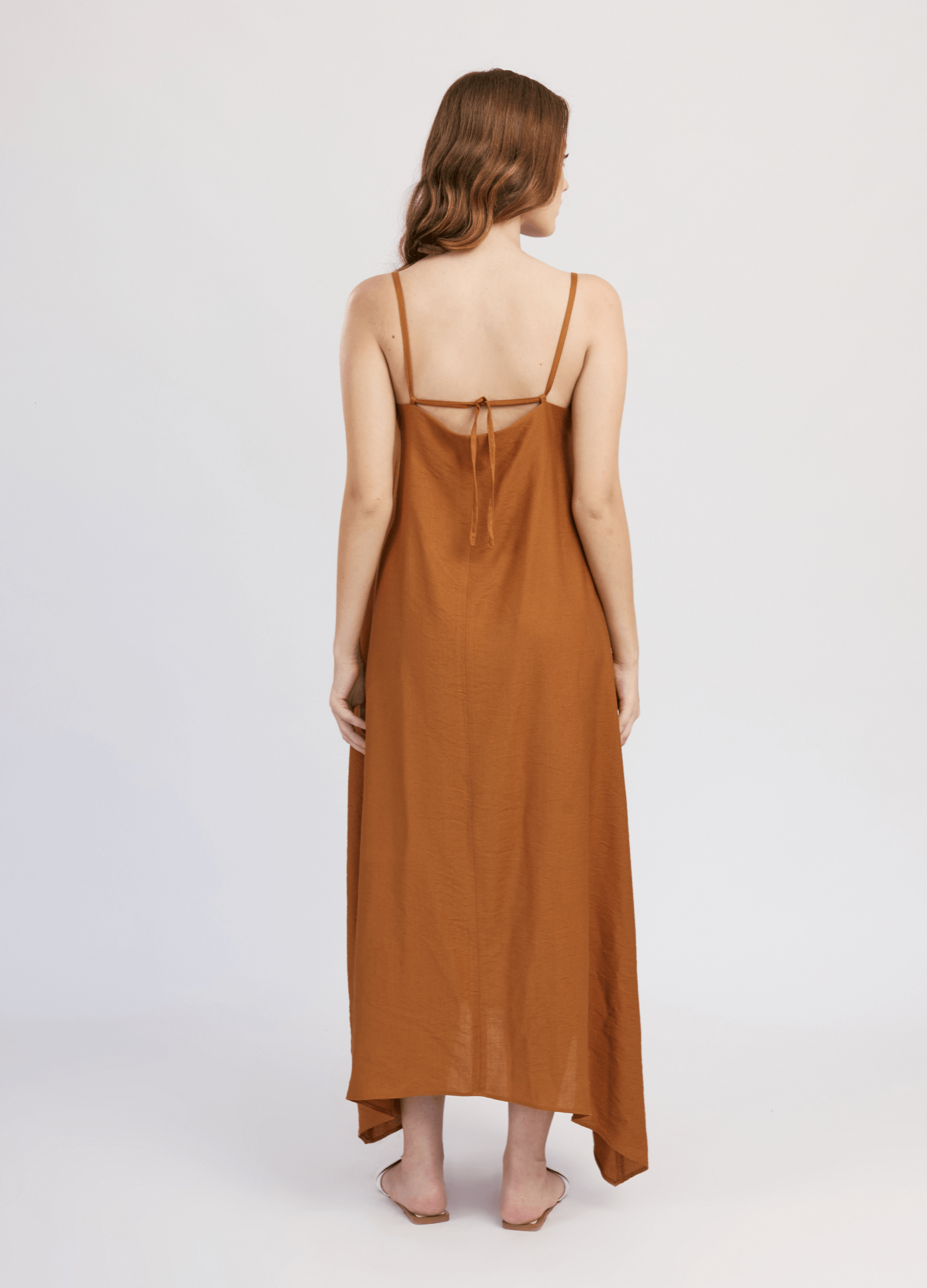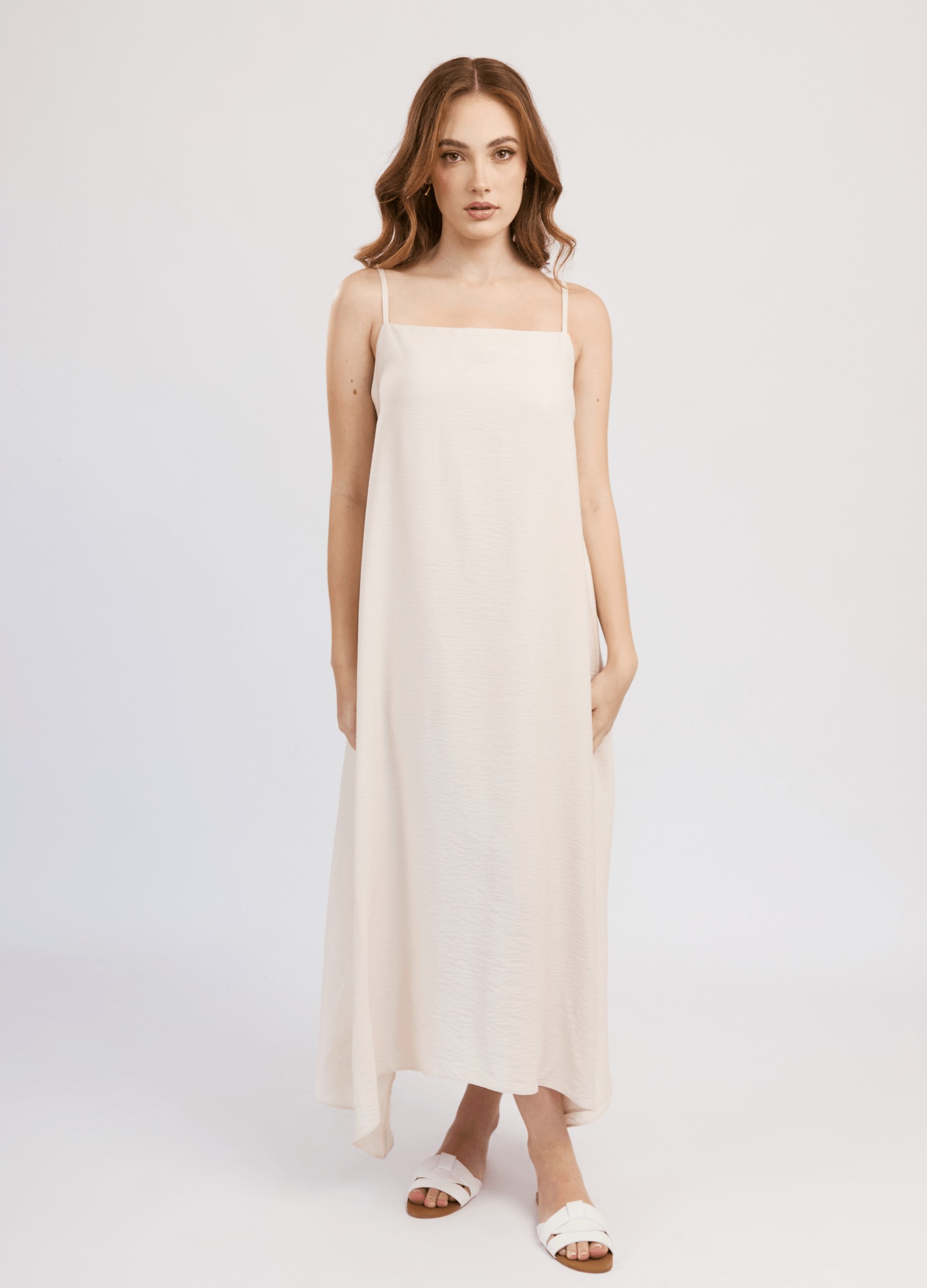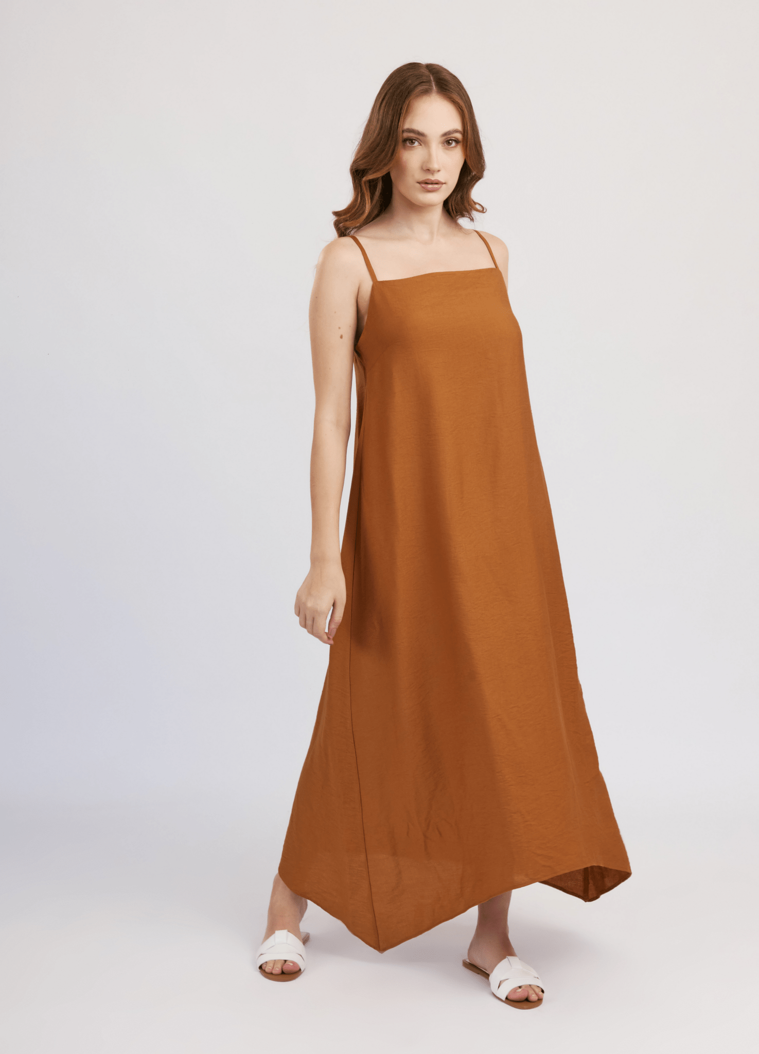 El vestido Oriana es ideal para los días calurosos. Su diseño holgado con escote recto y basta ovalada asegura frescura y comodidad. El sistema de cierre con tiras y presillas en la espalda añade un toque romántico, haciéndolo perfecto para salidas al aire libre o paseos por la playa.
