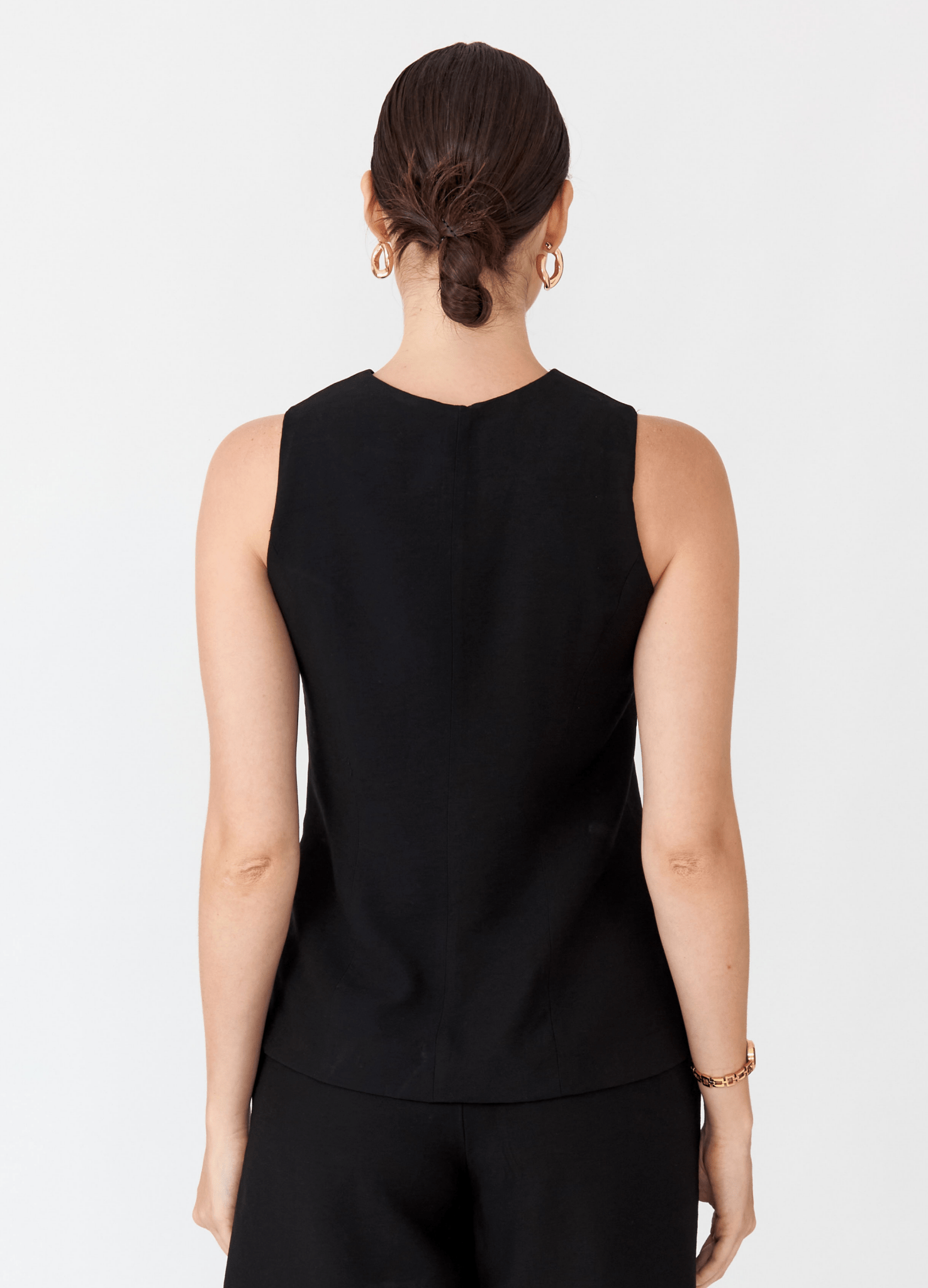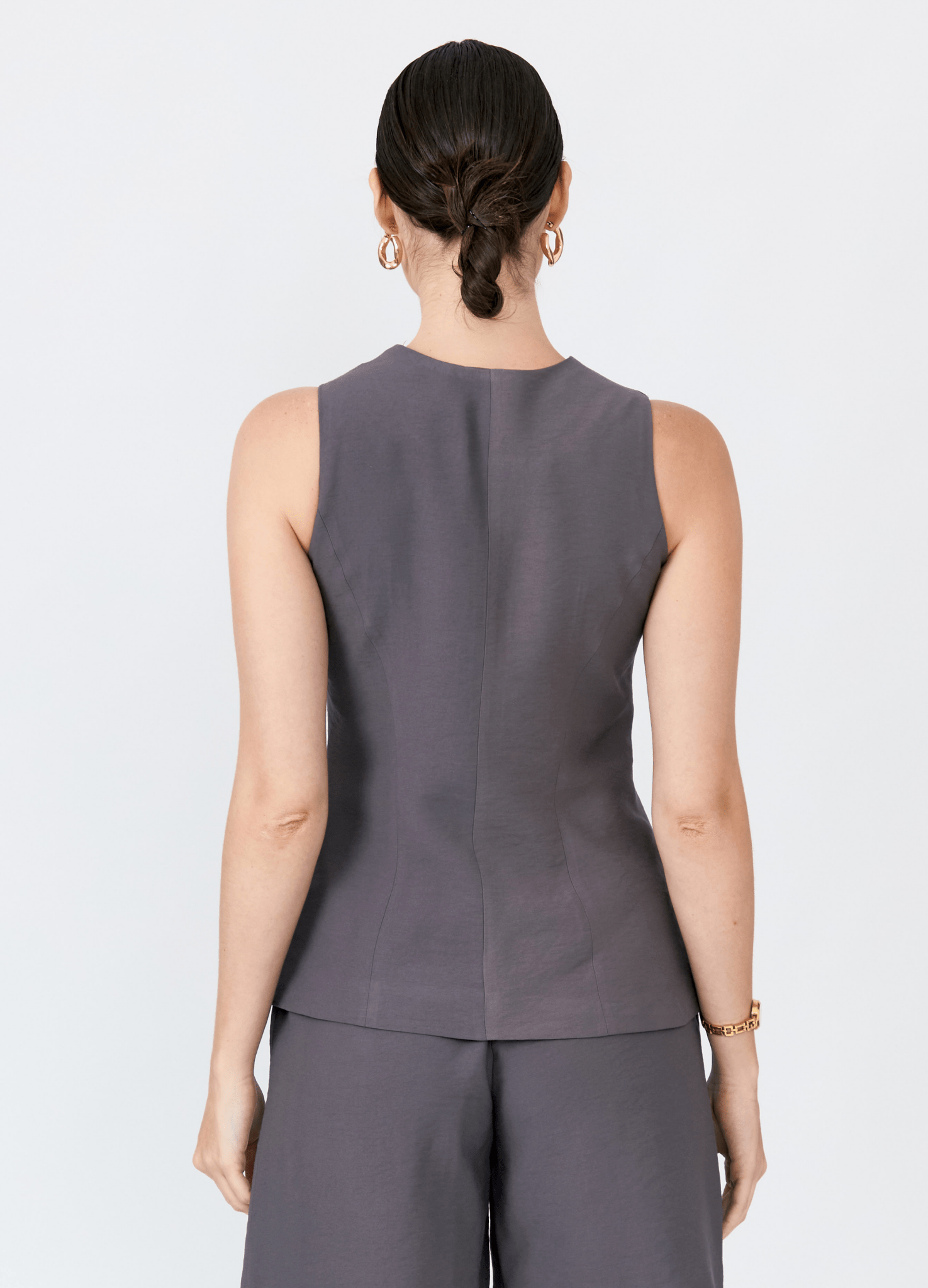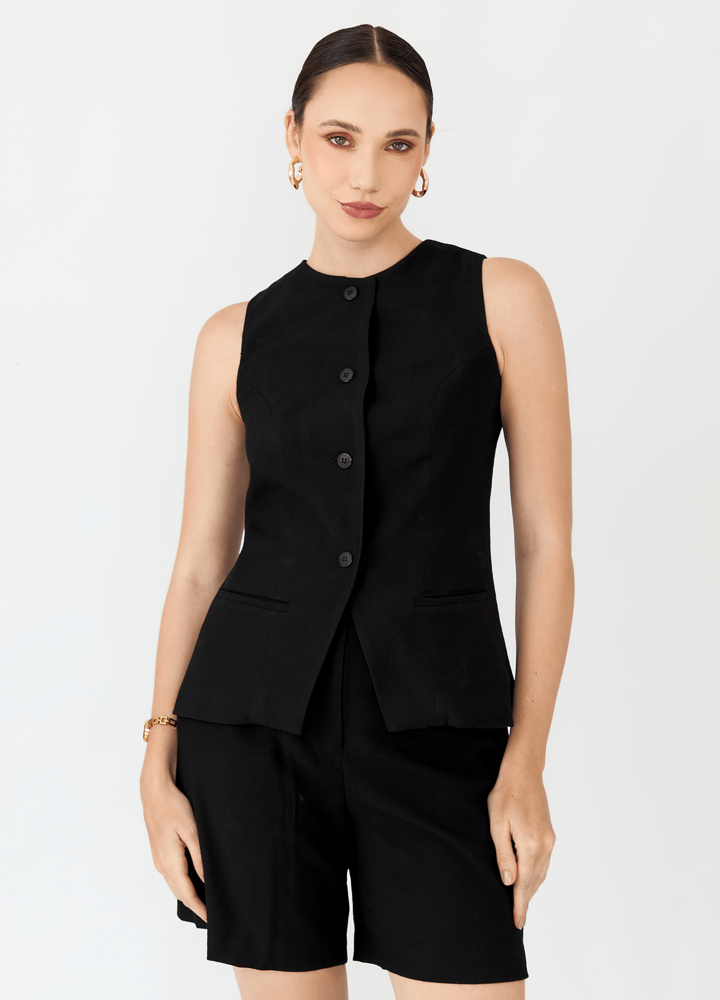 El Chaleco Alba es la prenda esencial y versátil que no puede faltar en tu guardarropa de verano, diseñada para lograr un look sofisticado y cómodo en cualquier ocasión. Su diseño comienza con un pulcro cuello redondo que enmarca el rostro con sencillez y elegancia. La estructura de este chaleco sastre se define por el corte princesa, aplicado meticulosamente tanto en el delantero como en la espalda, una técnica que garantiza una silueta excepcionalmente femenina y un ajuste perfecto al cuerpo.