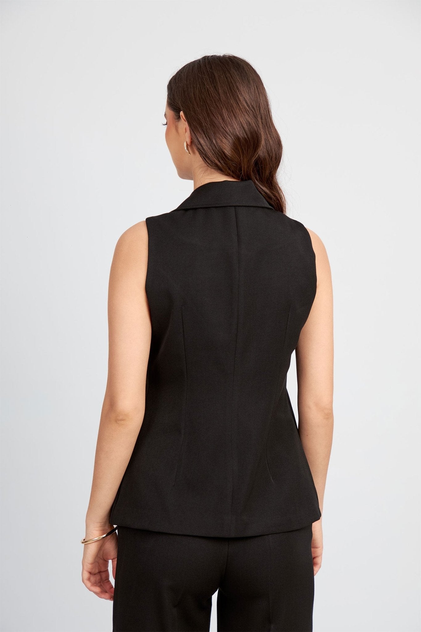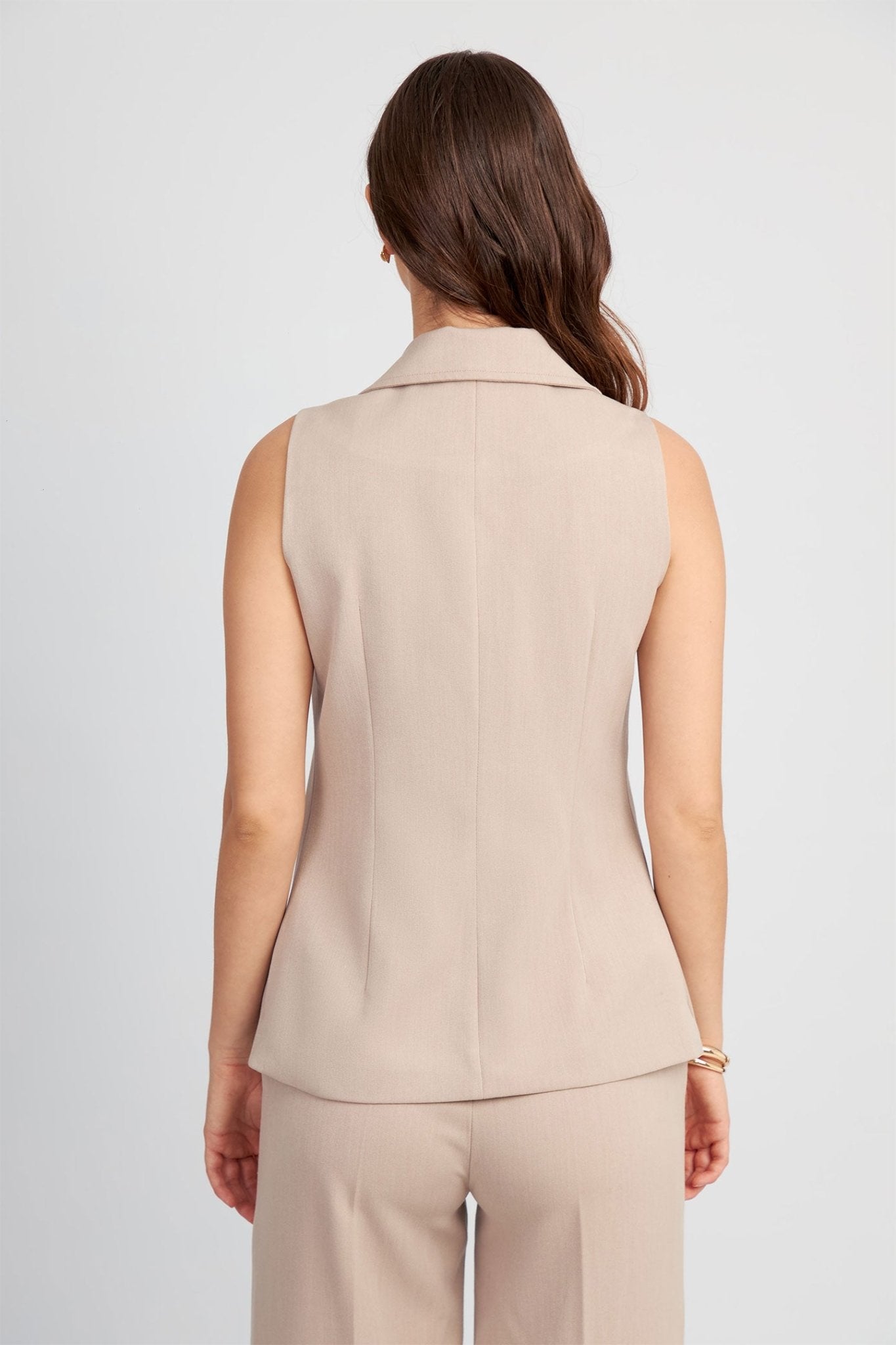 Los detalles de este chaleco son los que marcan una diferencia notable y le otorgan un carácter distintivo. Destacan las solapas de pico, un elemento clásico de sastrería, junto con los botones dorados que añaden un toque de lujo y refinamiento. Además, incorpora pespuntes cuidadosamente ubicados que estilizan visualmente la figura, contribuyendo a un look minimalista, pero con una fuerte personalidad. Es perfecto como capa de entretiempo en otoño, para llevar solo o sobre camisas ligeras.