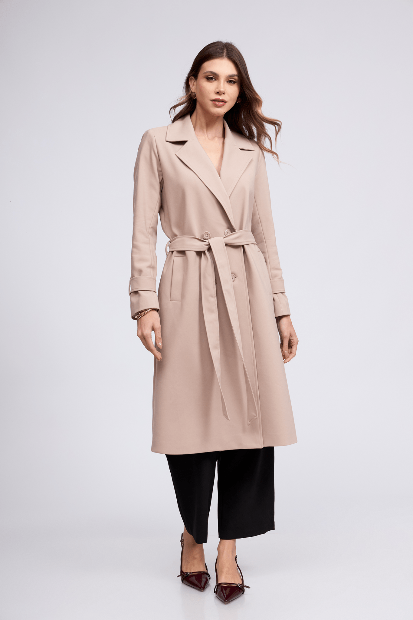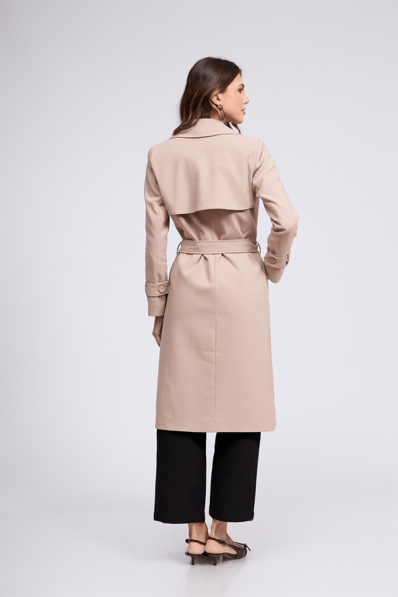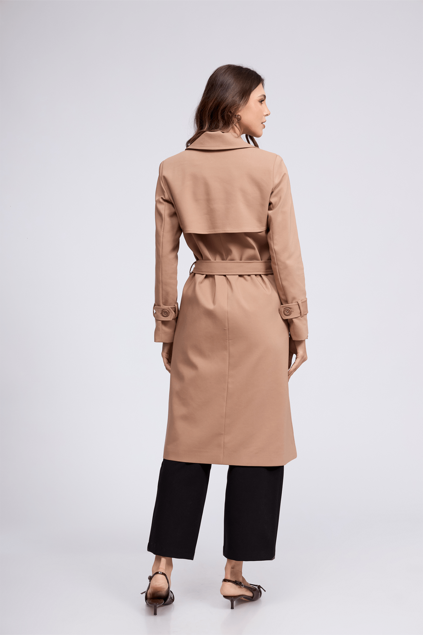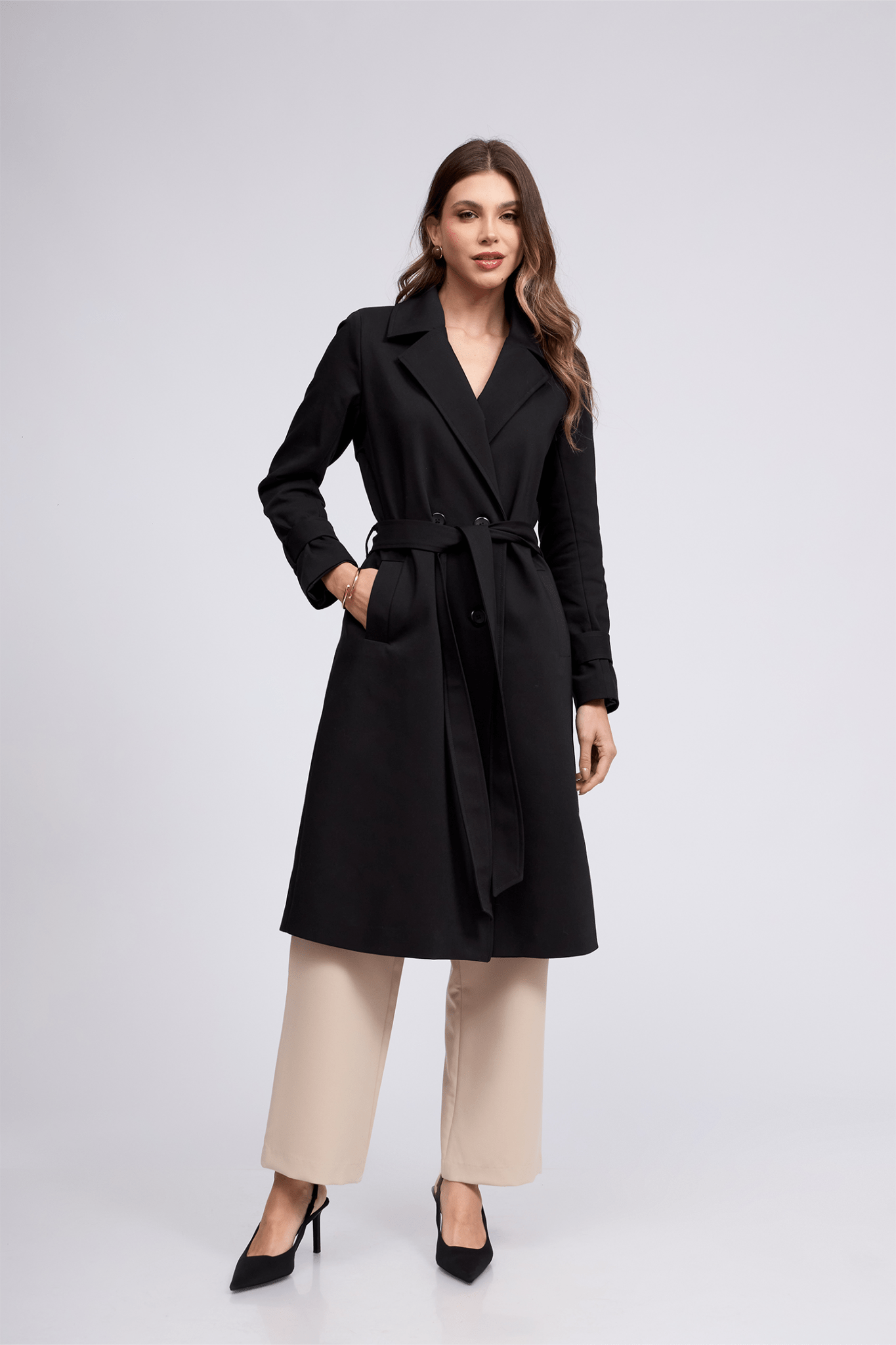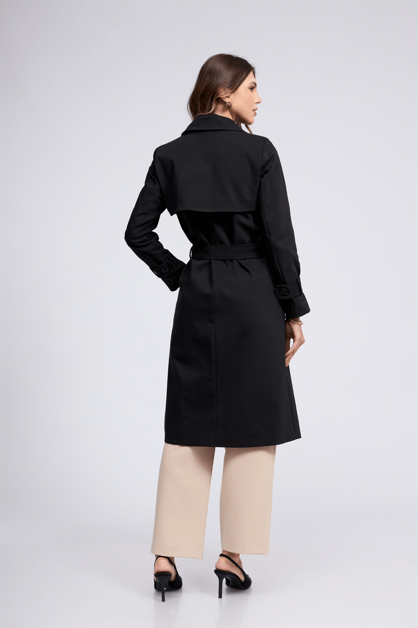 Gabardina larga de entalle perfecto, confeccionada en tela ideal para el cambio de estación. Con 4 botones frontales, correa amarrable y detalles decorativos en los puños, es la prenda clave para layering y para lucir como protagonista de cualquier outfit.