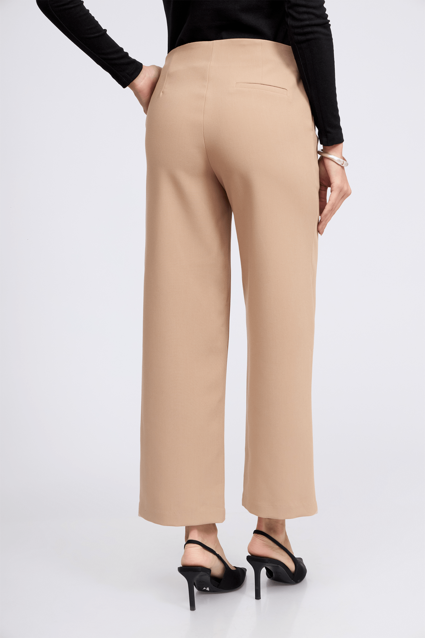 Pantalón minimalista de entalle recto y lineal, con planchado marcado que estiliza la figura. Incluye pretina interna, cierre con botón y bolsillos laterales, siendo una pieza versátil para todo tipo de looks.