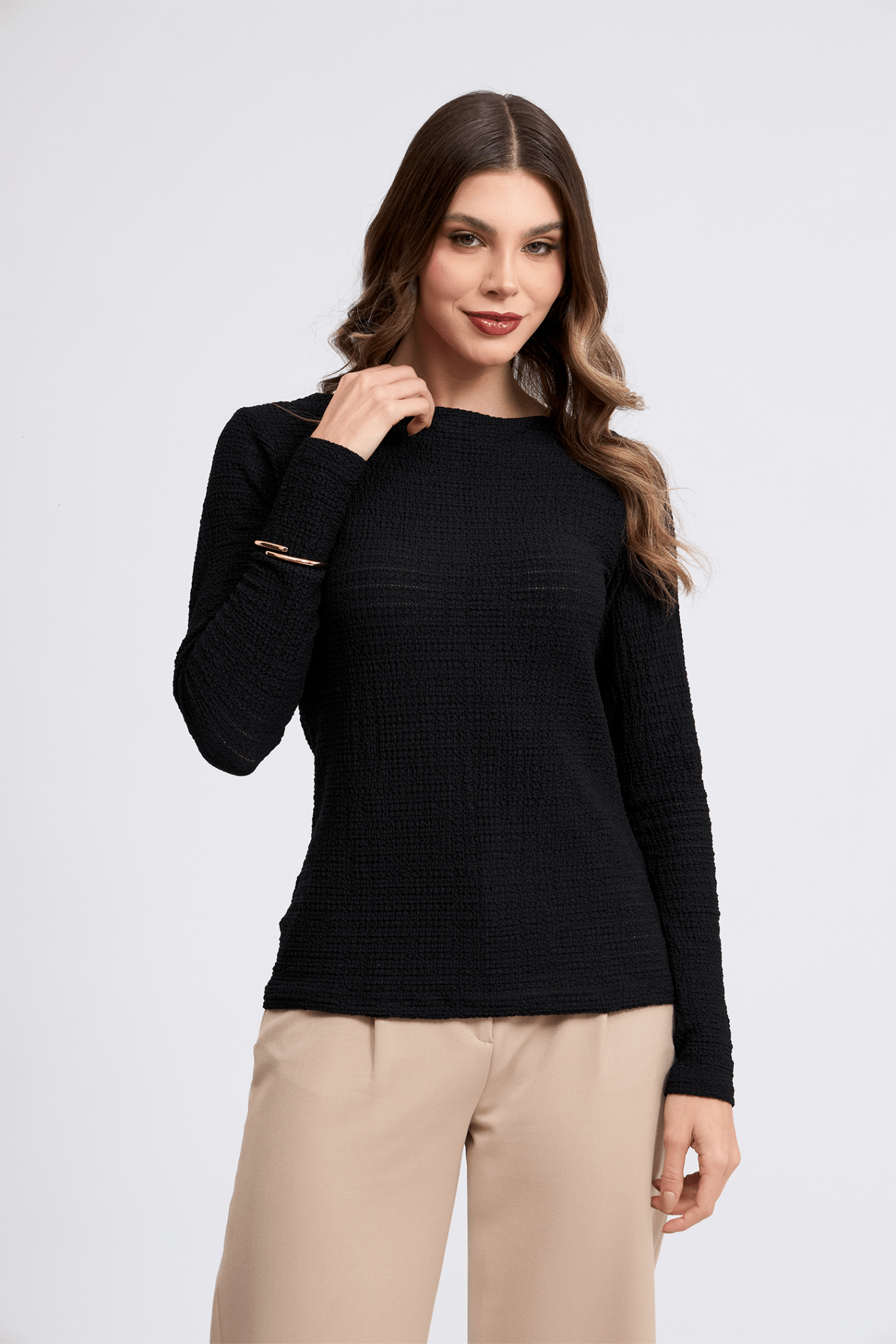 Top de manga larga en tela texturizada, con fit regular que aporta comodidad sin perder estilo. Una pieza versátil que eleva cualquier look y se convierte en la opción ideal para salidas o fiestas.